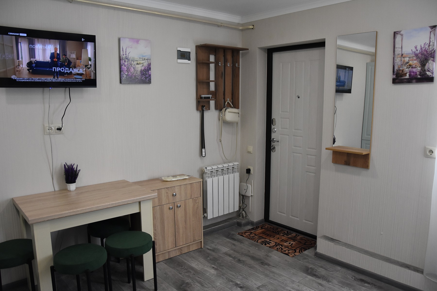 - Мебель: вешалка, диван, зеркало, стол, стулья, шкаф